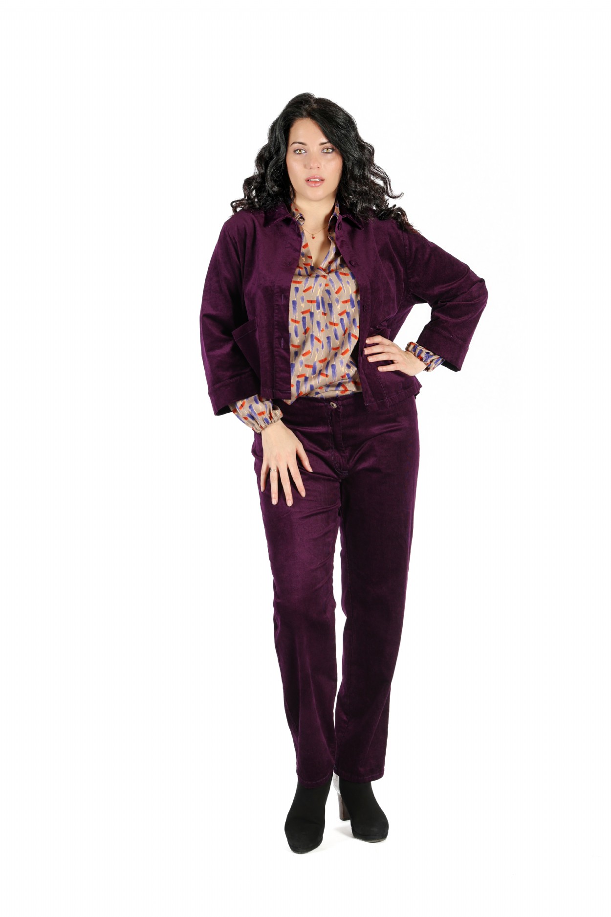 Il pantalone ha un taglio dritto e classico, con una vestibilità comoda ma ben strutturata. La vita è regolare, con chiusura frontale tramite bottone e zip nascosta. Presenta tasche anteriori oblique e tasche posteriori applicate, che ne valorizzano la linea semplice e senza tempo. Il tessuto, in velluto di cotone, conferisce al capo un aspetto caldo e sofisticato, con una texture morbida e leggermente brillante tipica del velluto. È un modello versatile, perfetto sia per look casual chic che per abbinamenti più eleganti.